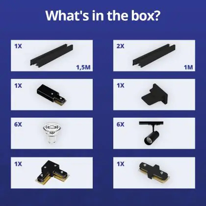 Beschrijving Complete Set 1-Fase Rail L 1,5 x 2 Meter Zwart | incl. 6x Spot + GU10 2700K 3W Dimbaar + Eindkap, Voedingsconnector en L -Verbindingsstuk
