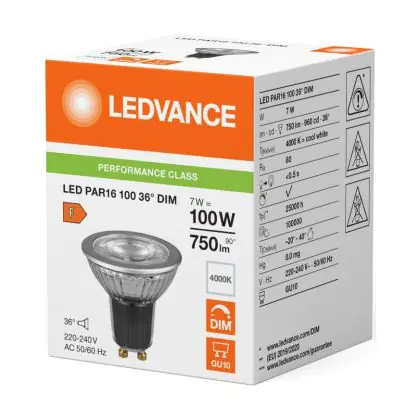 Beschrijving Ledvance LED PAR16 GU10 Reflector 7W 750lm 36D - 840 Koel Wit | Dimbaar - Vervangt 80W