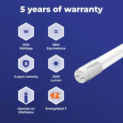 Deze Noxion LED TL buis heeft een Lumen / Watt efficiëntie van lm/W. Dit is de waarde die je verkrijgt door de lichtopbrengst (2300 Lumen) te delen door het wattage (22W) van deze lichtbron. Hoe weet je of jouw lichtbron een goede efficiëntie heeft? In dit geval ligt de lm/W waarde boven de 65. Je kunt er ook voor kiezen om een LED geïntegreerd TL armatuur te kopen. Hierbij heb je de keuze uit diverse (waterdichte) LED montagebalken, die in een divers aantal Lumen verkrijgbaar zijn. Een (dimbaar) LED paneel is ook een slimme optie, met name voor ruimtes met een systeemplafond (eenvoudige installatie) en kantoren (UGR<19 varianten).